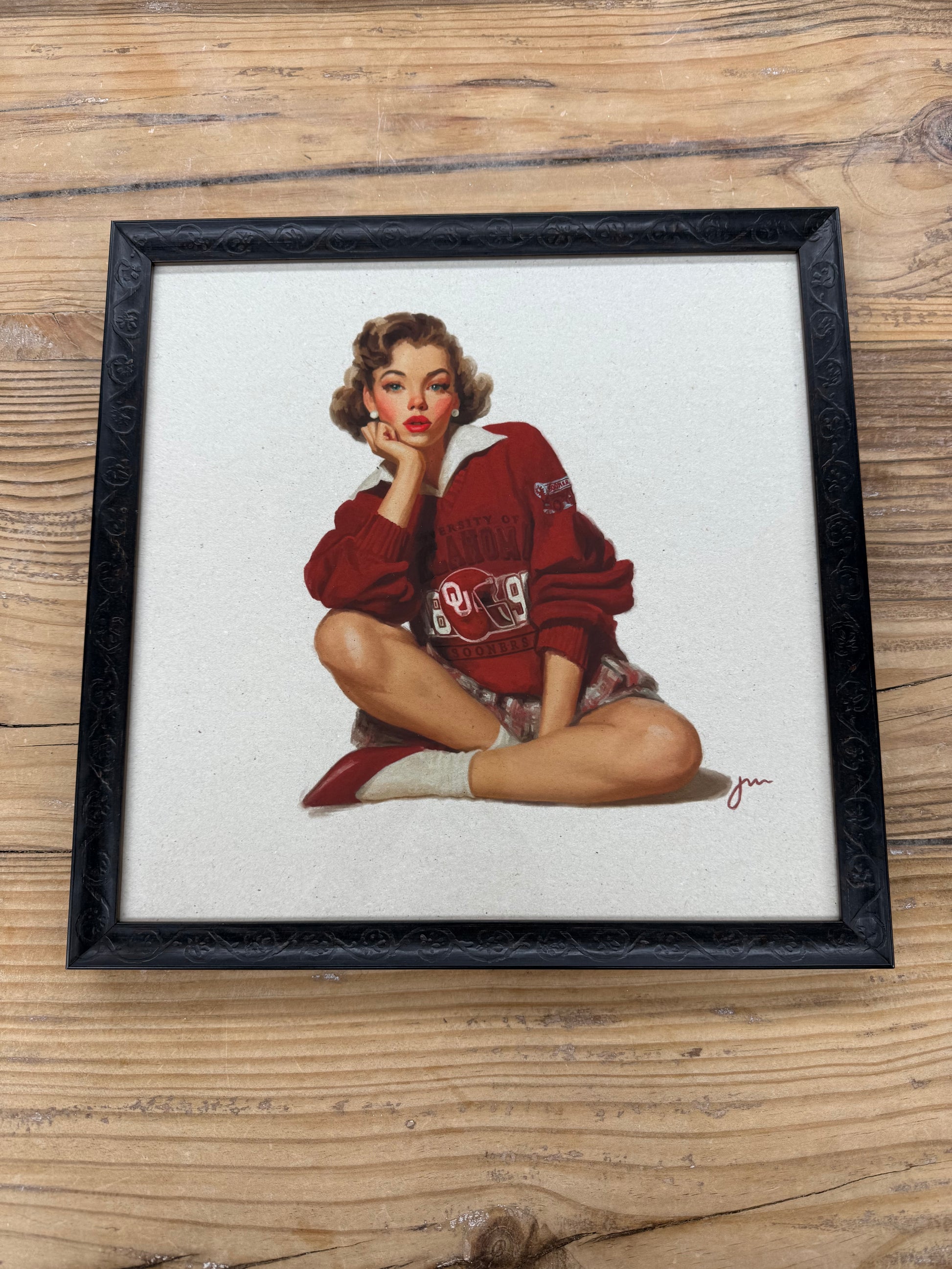 A playful pin-up series celebrating the spirit of the game. These gals bring vintage glam to the sidelines, blending the allure of classic centerfolds with the charm of game day darlins. From pep rallies to pro leagues, each piece captures the sweet spot where sports meet style and gives a wink of victory to every fan.
