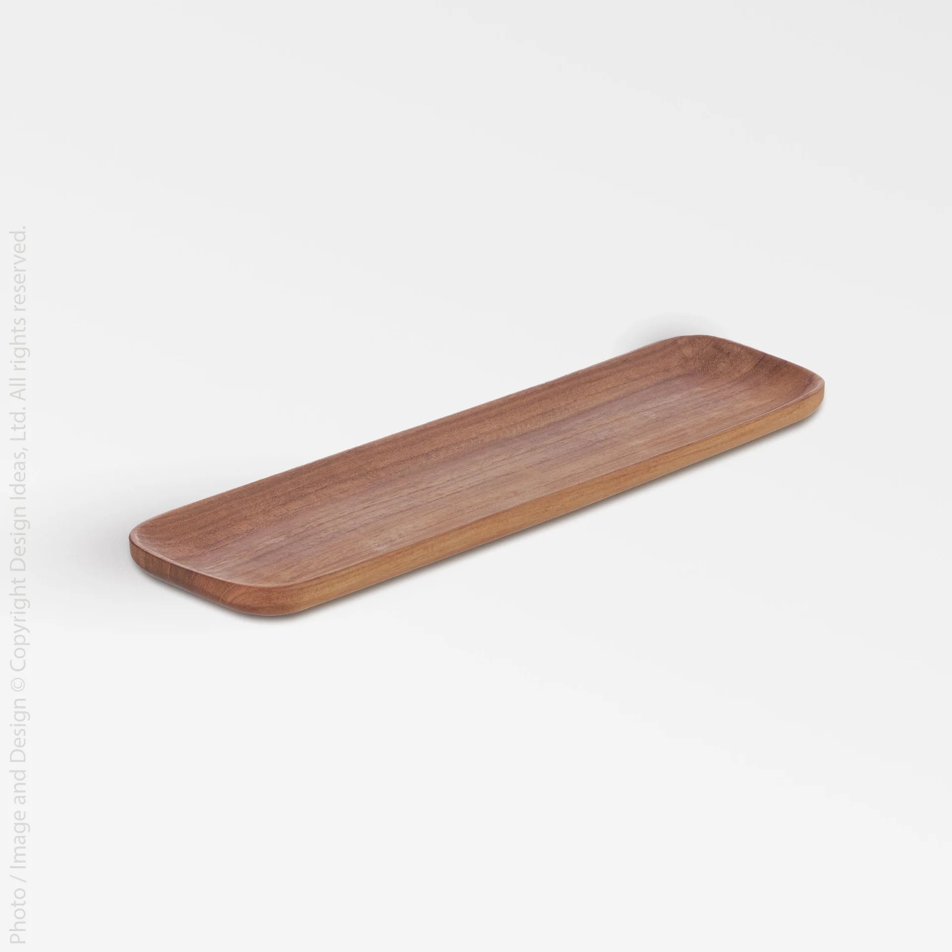 Elevate your entertaining with the Chiku™ rectangular platter. Artfully designed to impress, this versatile rectangular tray functions as a unique serving piece for your hosting needs. Perfect for an at home sushi night, a dessert tray, or maybe even utilize to hold your silverware on the table rather than placing them directly onto the table. The possibilities are endless with this petite serving platter. Made from hand-carved and sanded teak wood, it exudes modern elegance and is sure to complement any tablescape! Dimensions: 11.4” l x 3.2” w x 0.4” h