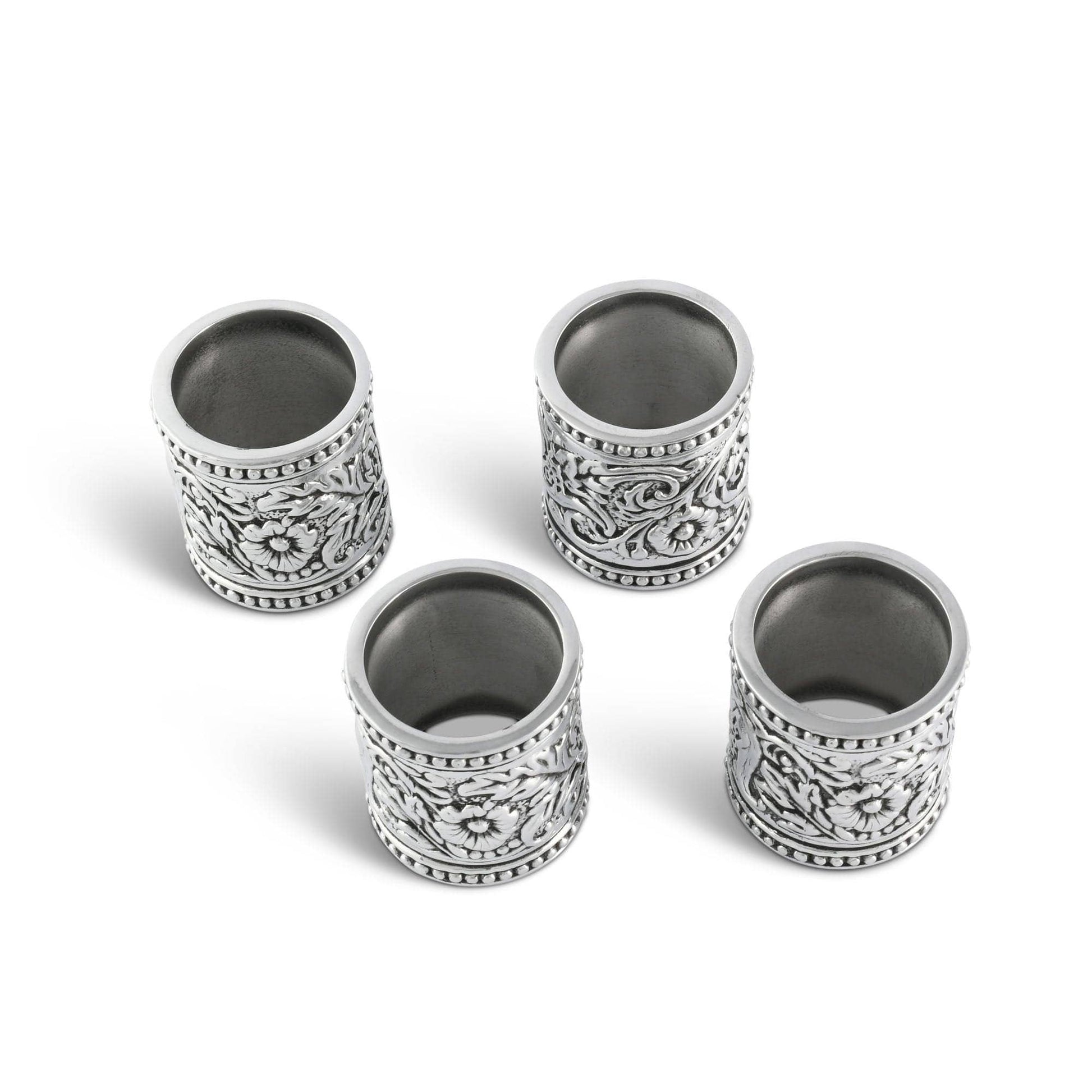 Create a blooming table setting with this set of four concho pattern napkin rings. These rings feature a delicate floral detail cast in lightly antiqued aluminum. Their circular shape seamlessly complements any decor. Let this napkin ring set add a fresh, regal touch to your tablescape for any casual or special occasion. These embellishments make an excellent gift for the consummate host, too. Size: 2.25"T x 2"W Care: Dust with a soft cloth