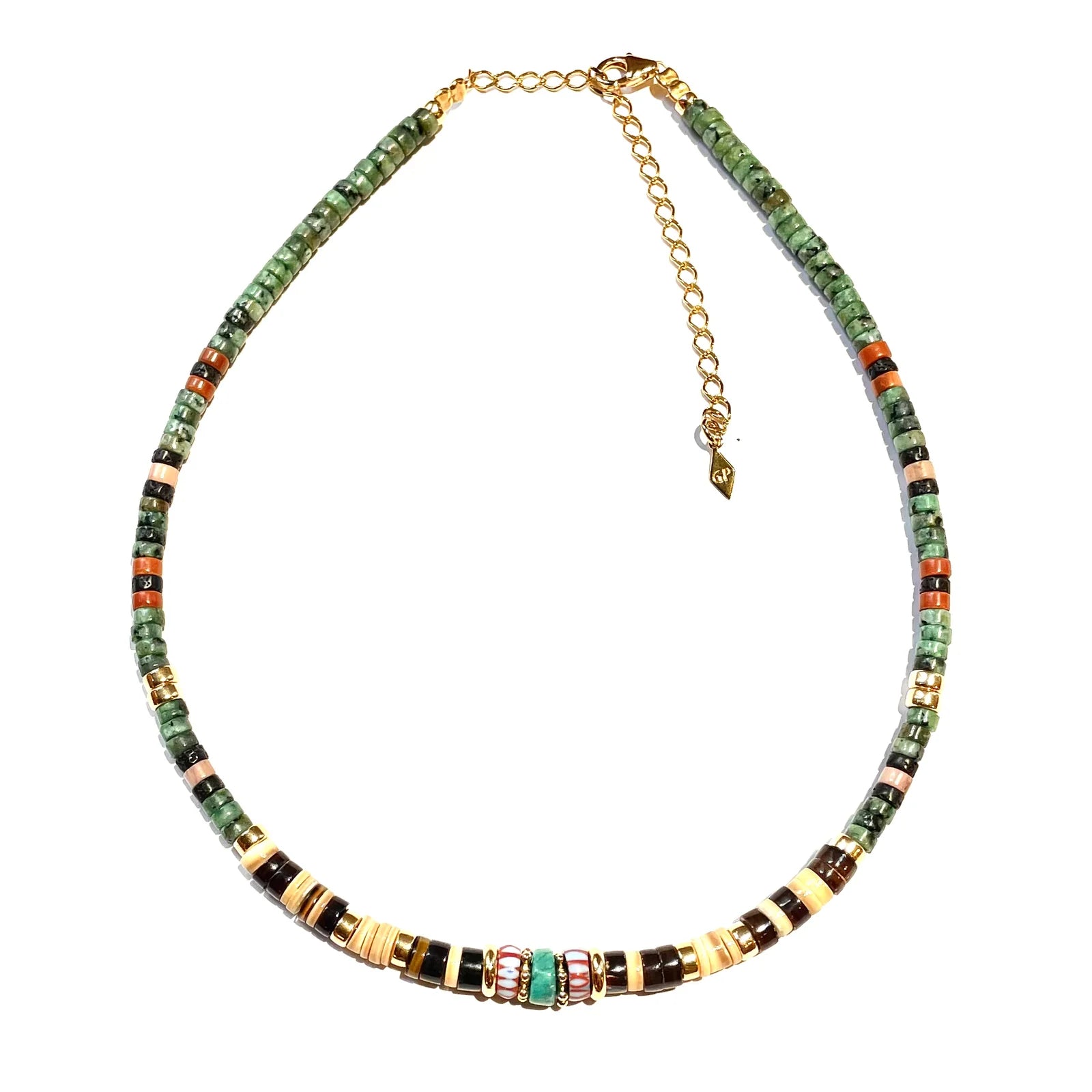 Shell, turquoise, jasper, vintage African beads and gold plated 18K.