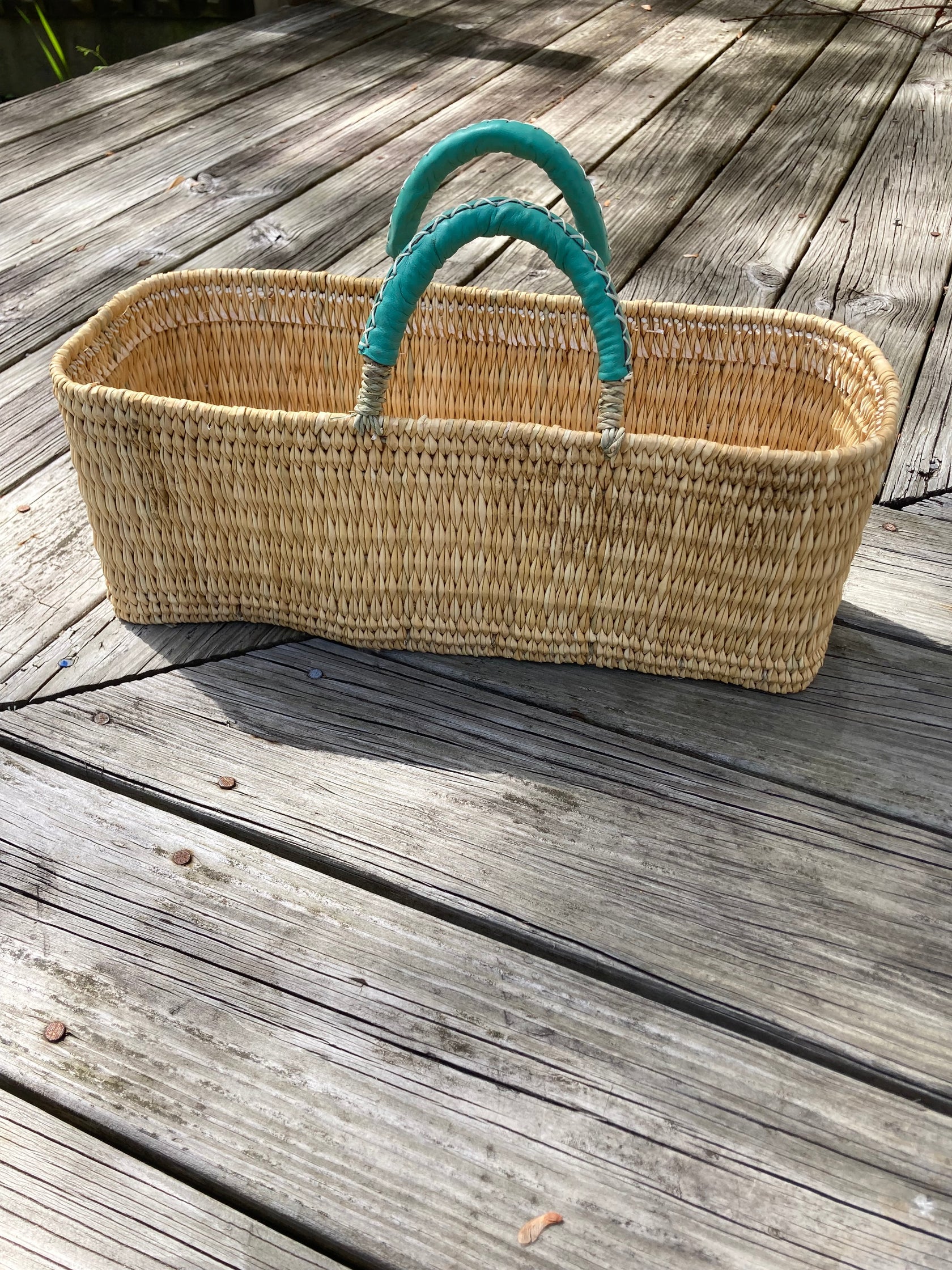 Our very cute and flexible styled garden trug-style basket-- charming for garden harvest but also the perfect size to hold a bottle of wine for a summer picnic, or style with house plants on a window sill. This sweet style is one of our best sellers, woven from water reed and with natural handles covered in toned leather with stitches.
