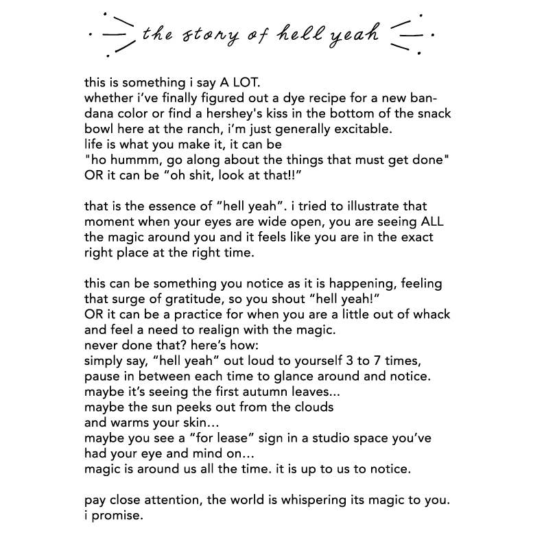 Small batch bandana - with the mantra “hell yeah” on one corner. SO many uses for a great quality bandana! from hiking, doggy beautification, camping and yoga, gardening, and just some gorgeous, on trend, western style! just pop it around your neck or tie on your tote bags. these bandana scarves also make excellent christmas / holiday gifts as each one comes with it's own hit of encouragement and inspiration. We make these bandanas to be used as talismans to help us remember everyday that we are so much stronger and more capable than we know.