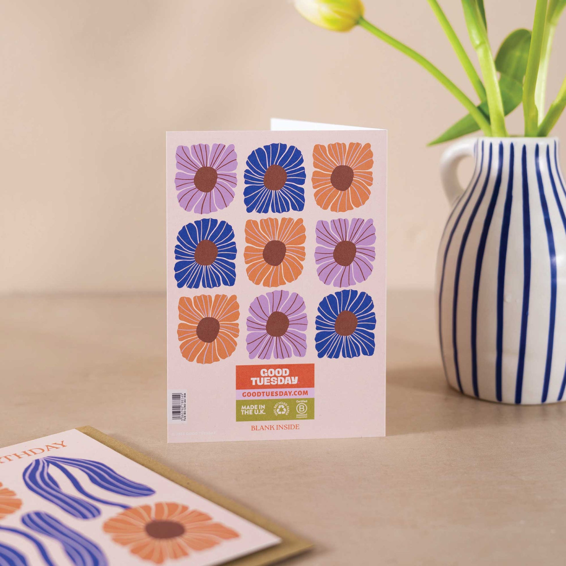 Designed to celebrate another year of growth and joy with this artsy floral birthday card. Retro illustrated flowers in a modern boho aesthetic (yes, thats a vibe) to send to a friend, family member or colleague for their big day. Flowers are timeless - and this card works for any age - from teens to adults, gender neutral. We think this would go ever-so-nicely with a fresh bouquet. Made for eco-conscious shoppers, the card is printed on 100% recycled, matte uncoated 350 gsm paper for a natural feel. Paired with a recycled kraft envelope, it’s a plastic-free option for your environmentally-minded customers. Product details: Blank inside A6 (10.5 x 14.8 cm // 4.1 x 5.8 in) 350 gsm uncoated 100% recycled paper stock Recycled brown kraft envelope included