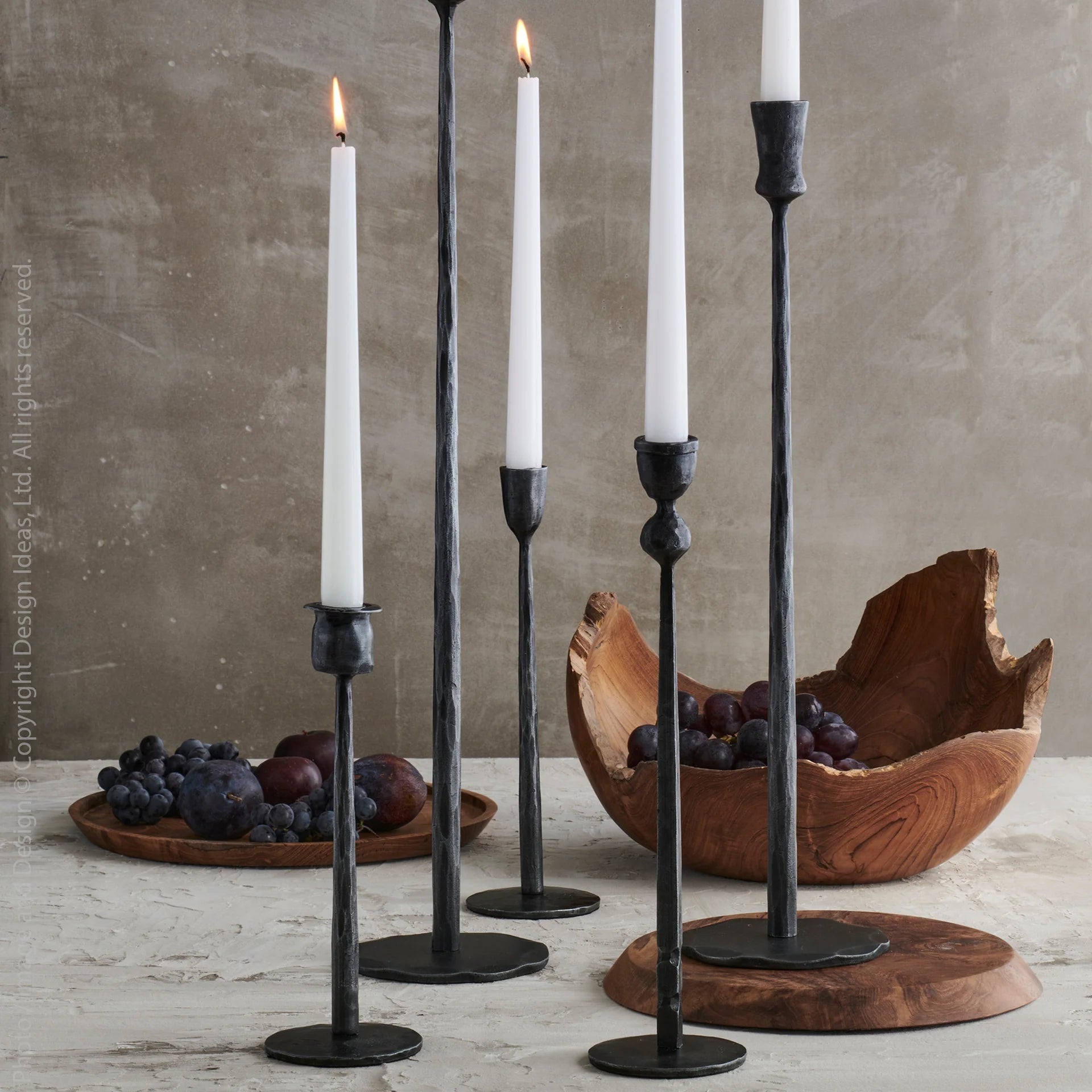 Our Jasper taper holders are hand forged in iron and finished with a rust proof coating. Starting with iron rod, our craftsman must heat and hammer each piece to achieve the desired length and detail. The process is incredibly time consuming, but the result is a piece that displays the artistry of the maker. No two pieces are alike.
