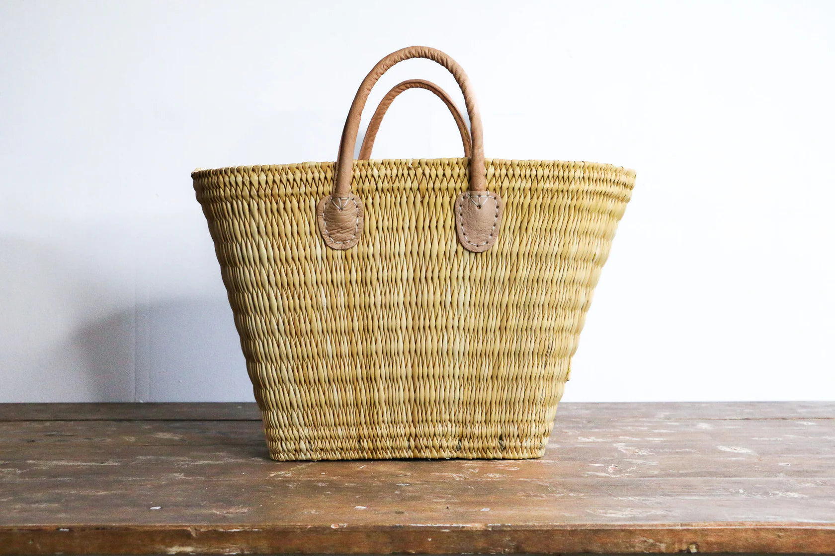Gorgeous keystone shaped tote with short leather handles, available in two sizes! Masterfully hand-woven with water reed by artisans in Morocco. This basket is great as a gift basket, for the beach and tote around town. These would also work as a perfect in-store shopper. Small and medium available, and they nest perfectly.