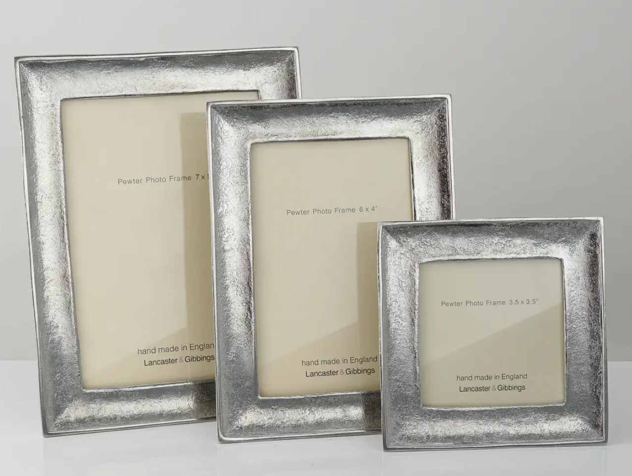 Handmade cast pewter photo frame. A simple profile reminiscent of the gentle texture of sandstone. By using a narrow profile, this design has a more classic proportion. This photo frame can be displayed either portrait or landscape.