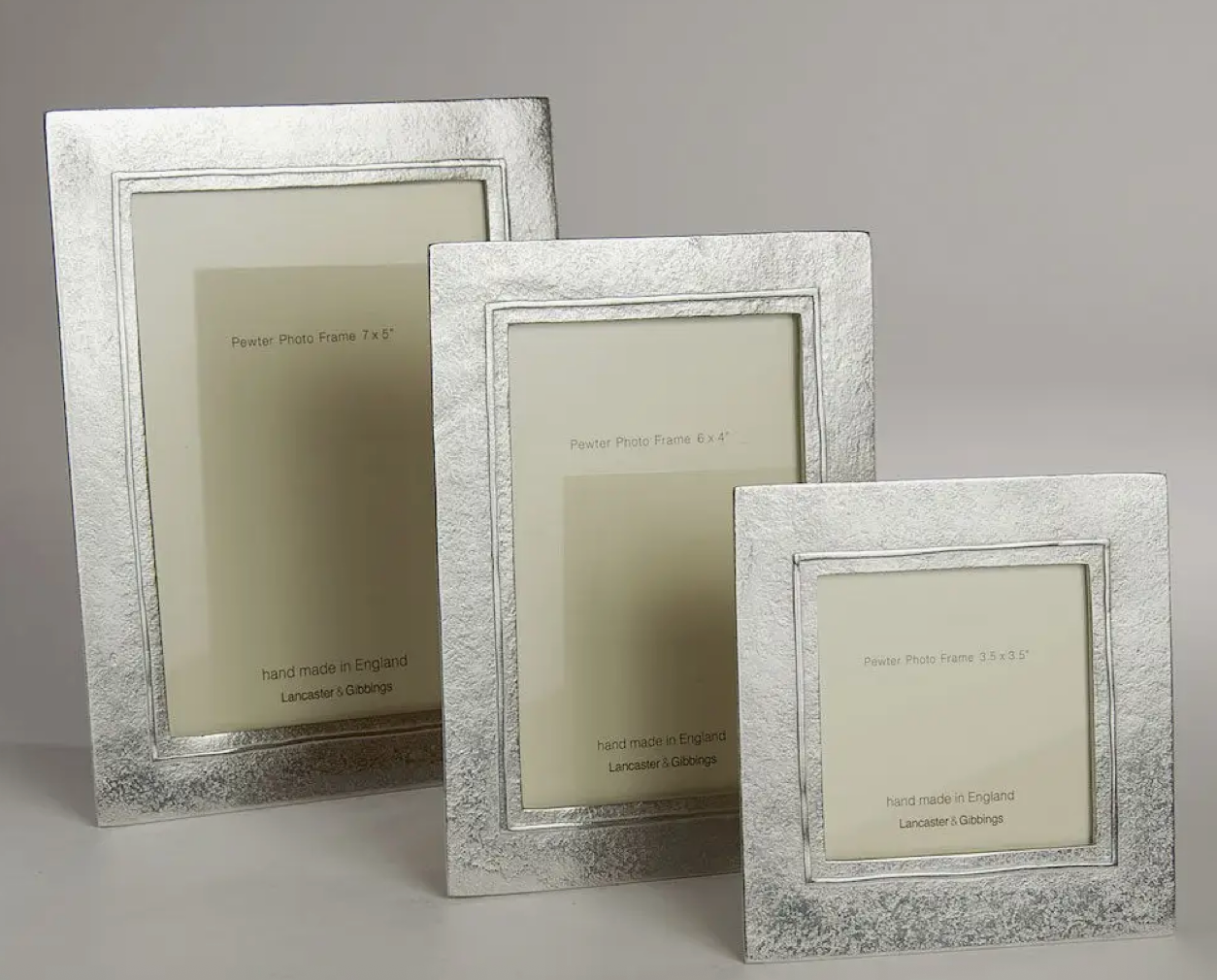 Handmade cast pewter photo frame. A simple profile reminiscent of the gentle texture of sandstone. By using a narrow profile, this design has a more classic proportion. This photo frame can be displayed either portrait or landscape.
