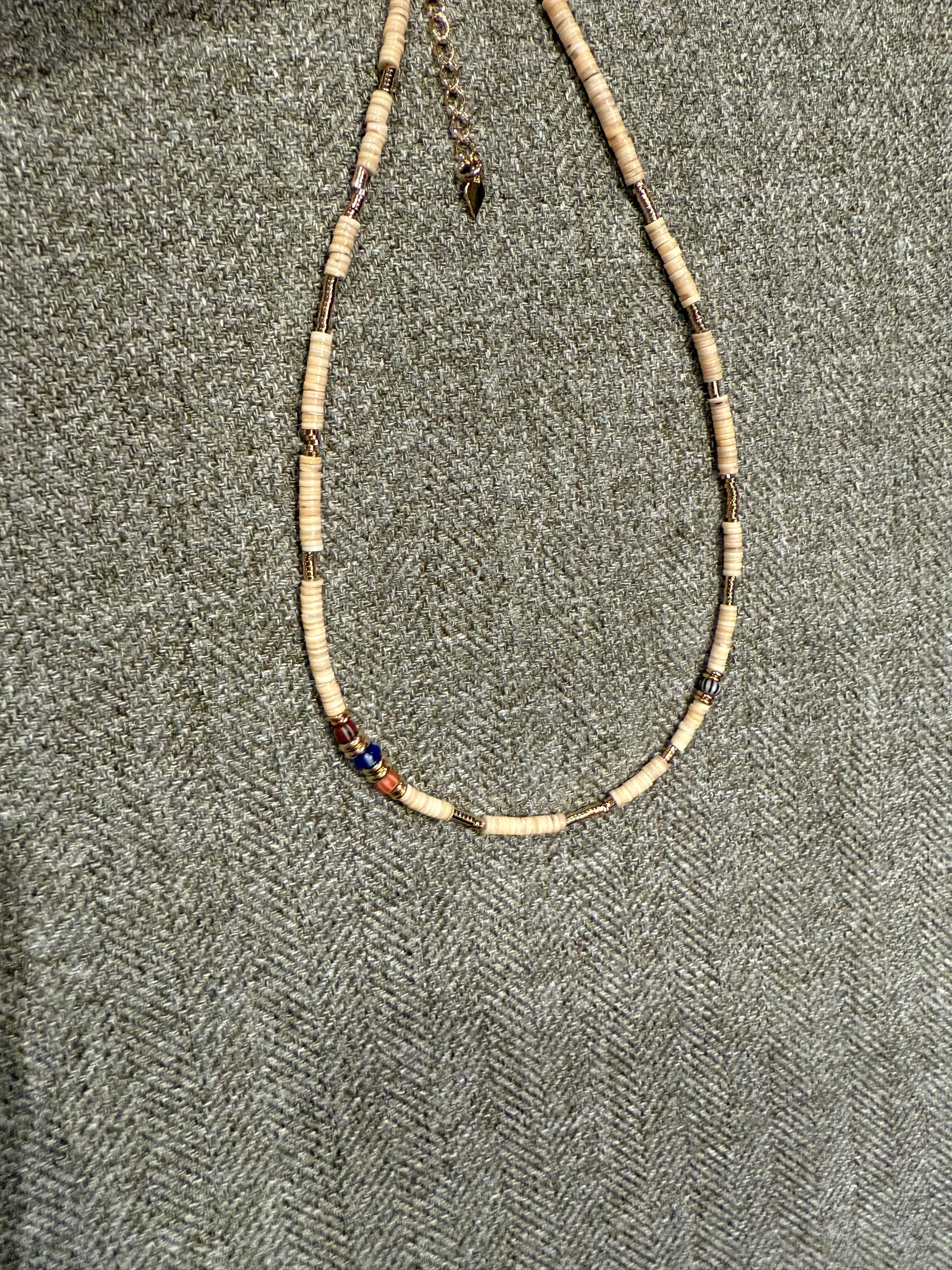 A strand of precious gold plated beads 3 microns 18K & brown shell. Gold plated pendants including a vintage jade clover and vintage chevron African beads.
