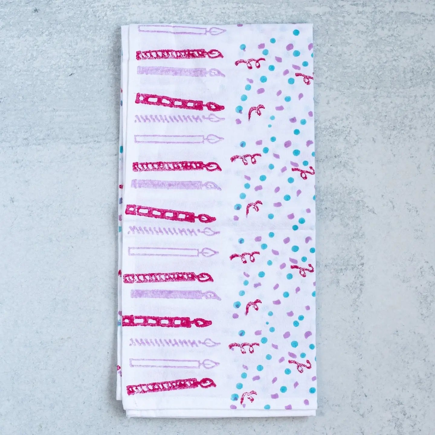 27" x 27" 100% Flour sack Cotton with convenient loop for easy hanging Hand block printed by survivors of modern day slavery Birthday Tea Towel - Sprinkles - Pink, Lilac & Saltwater OR Confetti - Green Orange and Blue