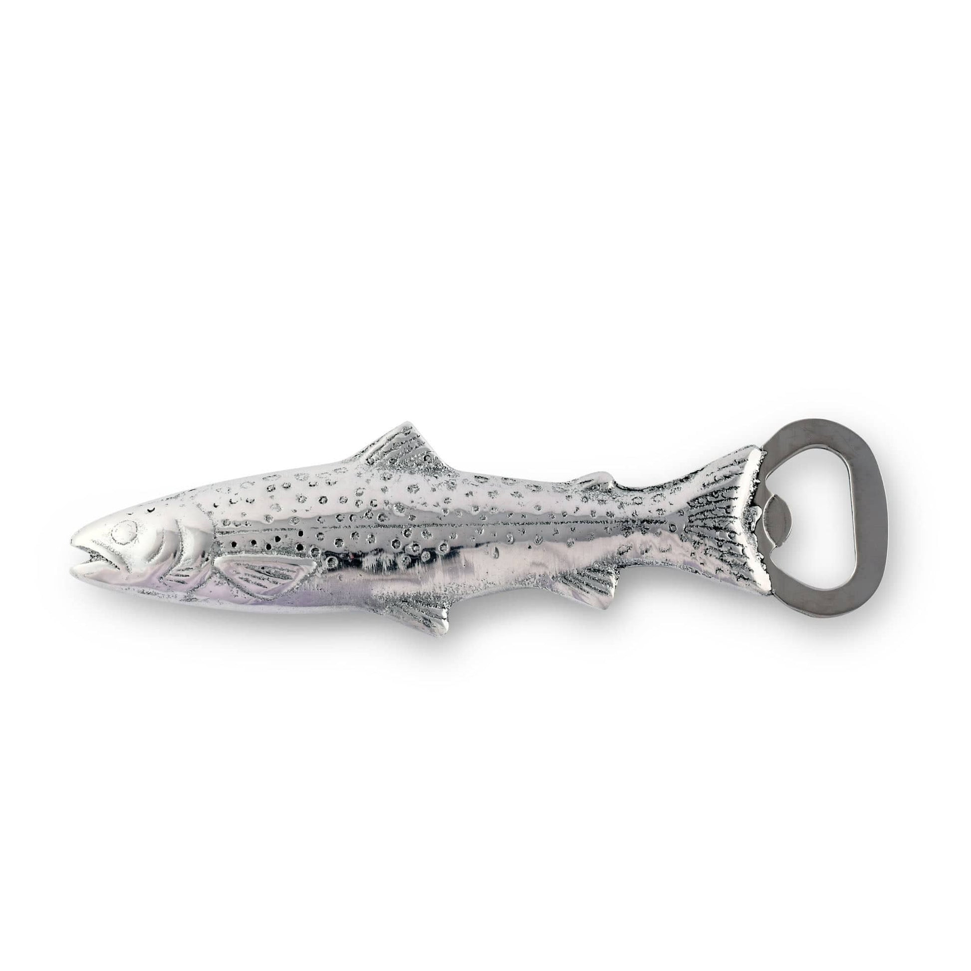 Delight the fisherman in your life with this trout bottle opener. The trout design of this opener has intricate detailing that includes scales and fin lines for a realistic appearance. This bottle opener is expertly crafted from sand-cast aluminum and stainless steel for lightweight sturdiness. It makes opening bottles virtually effortless, and it’s been hand-polished to a lustrous brilliance to accentuate any bar area. To clean this elegant and functional opener, just hand wash it with dish soap and hand dry. This Arthur Court trout bottle opener comes in a high-quality gift box, so it’s ready for presentation. It makes an excellent gift for anglers, and it also serves as a beautiful accent for home bars decorated in a rustic style.