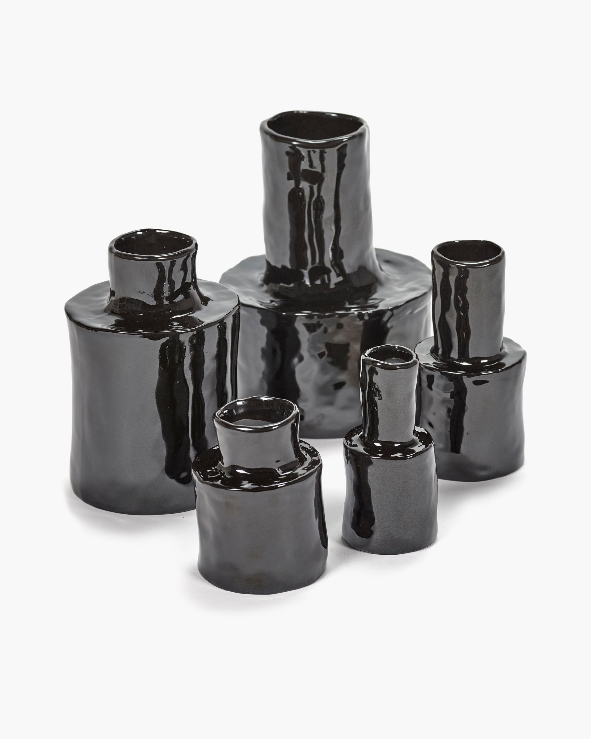 The five vases in dark brown, almost black stoneware are Marie Michielssen's first steps as a ceramist. Anyone who follows her work will know that Marie likes to work with her hands. Earlier, she said that modelling with plaster and paper-mâché was like a form of meditation for her because of the repetitive nature of the actions. Therefore, the step towards ceramics was not so big. The simple cylinders are irregularly shaped, the hallmark of artisanship. Thanks to their unique character, they are decorative with or without flowers.L 5,51 W 5,51 H 7,87 INProduct Weight:Material: stone